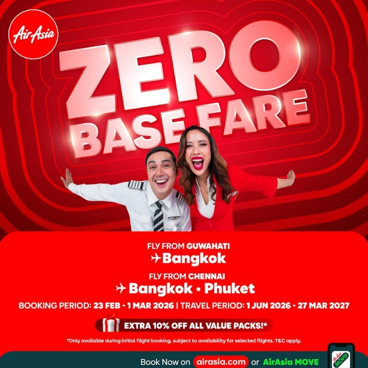 From now till 1 March 2026, fares on all of AirAsia and AirAsia X’s routes from India with flight codes AK, FD, D7 & XJ will be on sale, with promos starting from zero base fare, up to 99% off and up to 60% off for travel between 1 June 2026 and 27 March 2027 via airasia.com or the AirAsia MOVE app and via online travel platforms. Feel like basking in Thailand’s bustling city vibes? Enjoy zero base fares to Bangkok and Hat Yai from Guwahati and Chennai respectively, and up to 99% to Kuala Lumpur from Thiruvananthapuram. Travellers from New Delhi, Hyderabad, Bengaluru and Ahmedabad can also jet off to Kuala Lumpur and Bangkok with fares of up to 60% off.