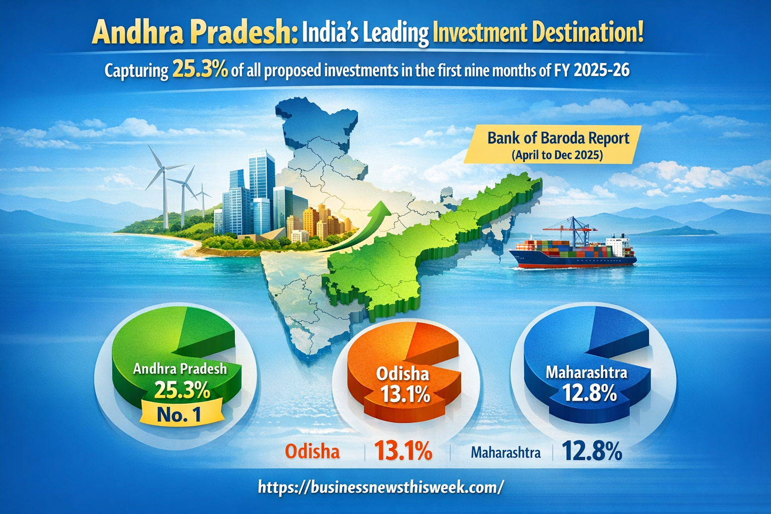 Amaravati, Jan 3: Andhra Pradesh has firmly established itself as India’s leading investment destination, capturing a remarkable 25.3 per cent of all proposed investments in the first nine months of the financial year 2025-26, according to a report by Bank of Baroda.