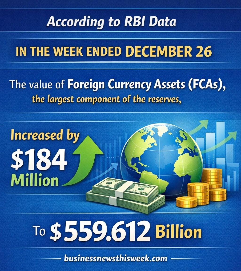 According to RBI data, in the week ended December 26, the value of foreign currency assets (FCAs), the largest component of the reserves, increased by $184 million to $559.612 billion.