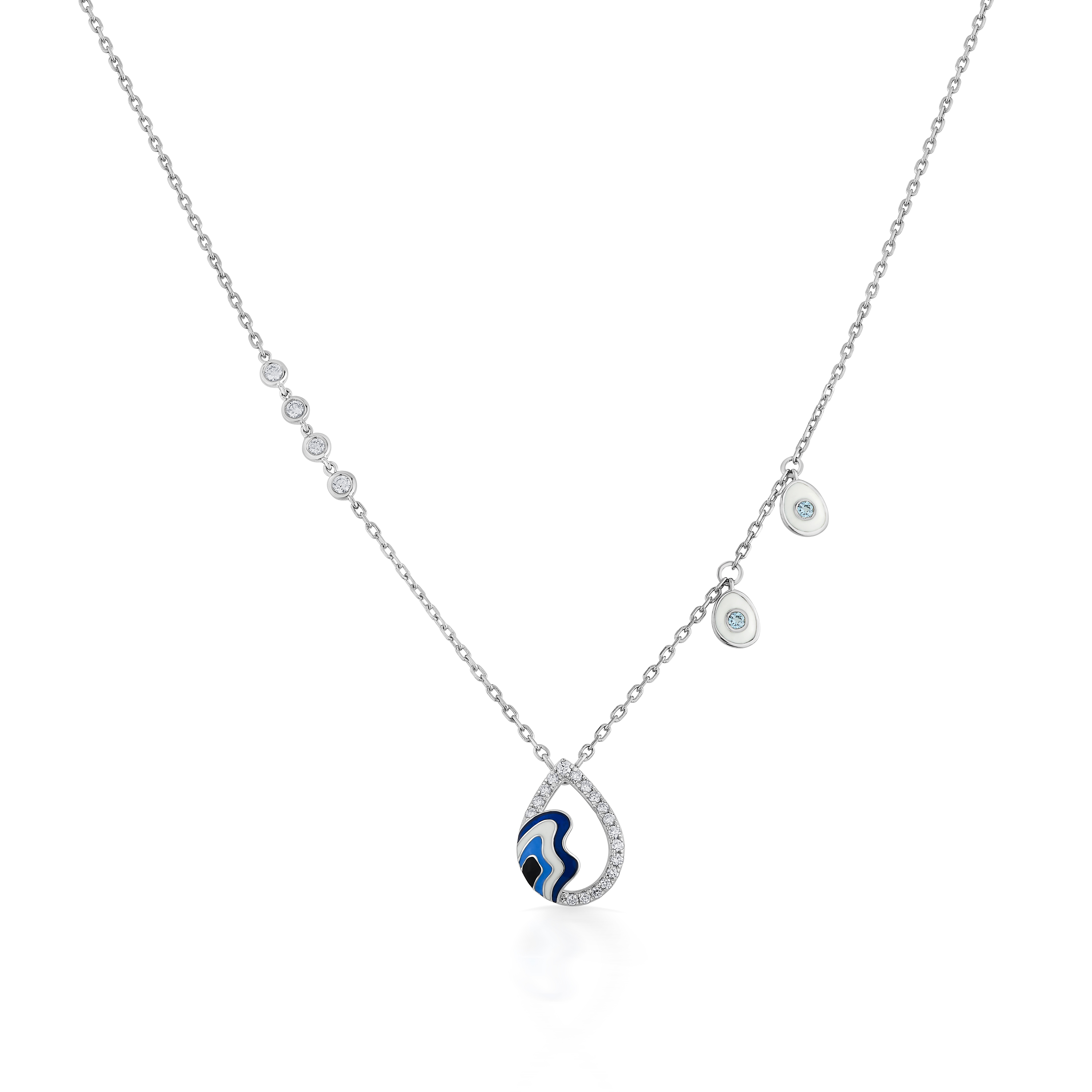 This design reimagines the motif through a softer, fluid lens. Shaped in a gently melting teardrop form, the piece departs from rigid lines to create a sense of organic movement. Diamonds trace the curve, while enamel detailing introduces contrast without overpowering the silhouette. Suspended from a fine chain accented with delicate elements, the necklace embodies modern protection—thoughtful, elegant, and quietly powerful.