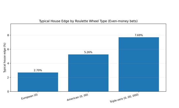 - Triple-zero (39 pockets): house edge is 3/39 ≈ 7.69%