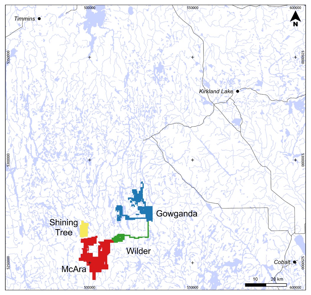 The Gowganda project is located 75 km southwest of Kirkland Lake in the Van Hise, Haultain, Milner, Nicol and Lawson townships that host the historic Gowganda silver-cobalt camp, which produced 60 million ounces (“oz”) of silver between 1910 and 1989. The property consists of 626 mining claims encompassing 9,219 hectares (35.6 square miles) situated along the eastern flank of the historic mining camp.
