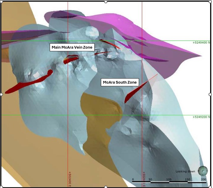 The current strike length of the zone: composite longitudinal section is 90m, depth 170m. Detailed structural studies in 2022 identified that extensional drill targets down plunge to the west on the main vein zone and that the south and main vein zones may be a conjugate set (with additional drilling required to better delineate the mineralization).