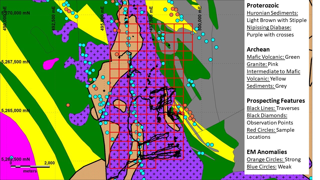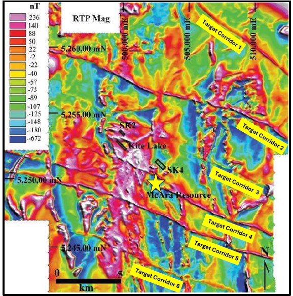 The McAra deposit is centred within an Archean metavolcanic inlier in contact with Huronian basin sedimentary rocks and proximal to a northwest-southeast striking regional structure. At property scale the regional magnetics clearly define six northwest-southeast trending structural corridors as targets (See Figure 3). Ground follow-up and geophysical surveys are required to identify drill targets in areas underlain by favourable geology within the six regional fault corridors.
