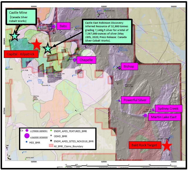 The Cobalt Embayment hosts over 70 silver-cobalt deposits that have collectively produced approximately 525 million ounces of silver and 50 million pounds of cobalt from high grade five-element (silver-cobalt-nickel-bismuth-arsenic) veins in the Cobalt, Gowganda and Elk Lake mining camps. Much of the exploration and development that occurred in the last century primarily focused on silver with bi-product cobalt. The region hosts multiple high-grade silver and cobalt vein style targets.