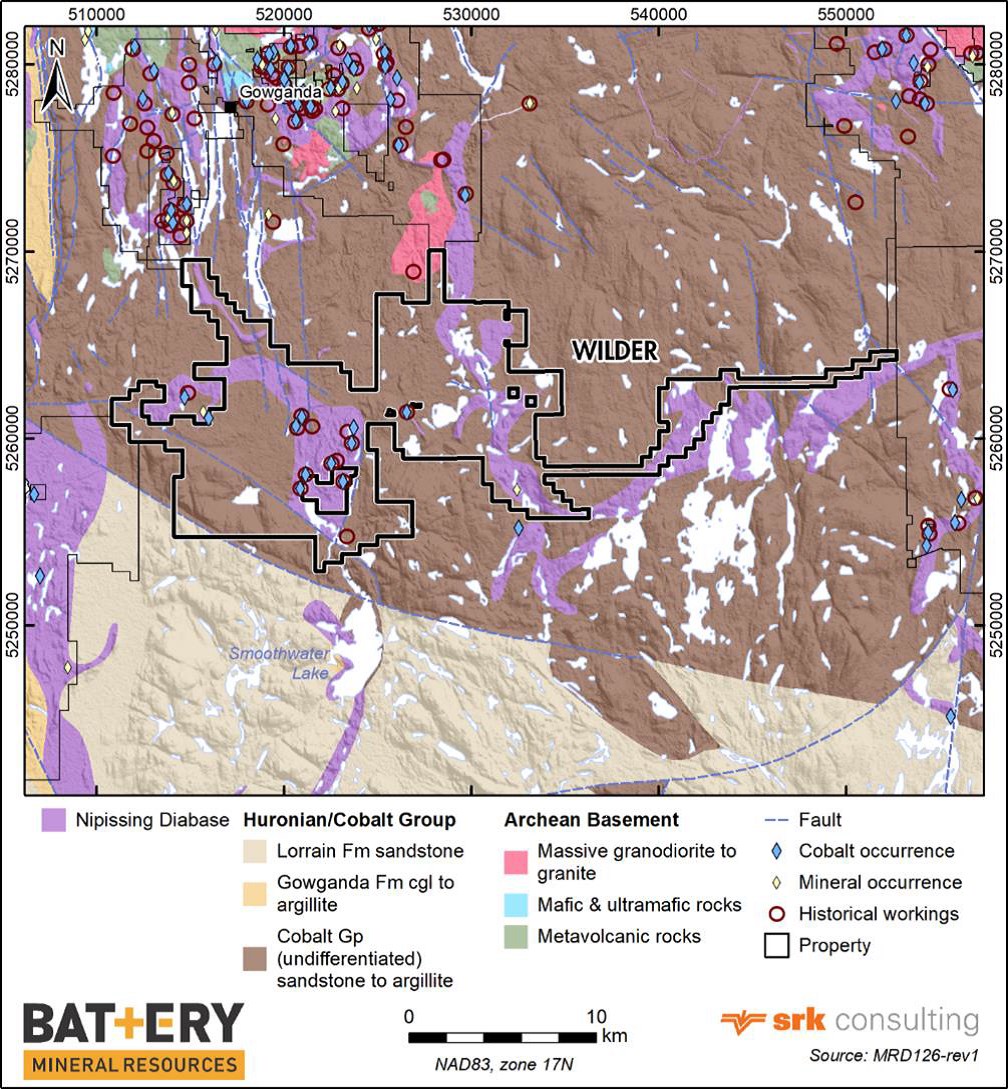 Wilder geology comprises variably exposed Huronian Supergroup metasediments and Nipissing diabase intrusions. Huronian rocks in the project area belong to the Gowganda and overlying Lorrain formations. The size and geometry of this Nipissing diabase sill are like ore-hosting sills at the established historic Cobalt and Gowganda mining camps. The target area has “Nipissing Basin” geometry—like the historic Cobalt camp. In the central portion of the Wilder property the Nipissíng diabase hosts five cobalt showings in 5 km long north-south faulted block adjacent to a prominent airborne magnetic low and a radiometric high. Wilder is prospective for contact-style McAra style silver-cobalt mineralization with much of the Nipissing-Huronian contact untested by drillholes.
