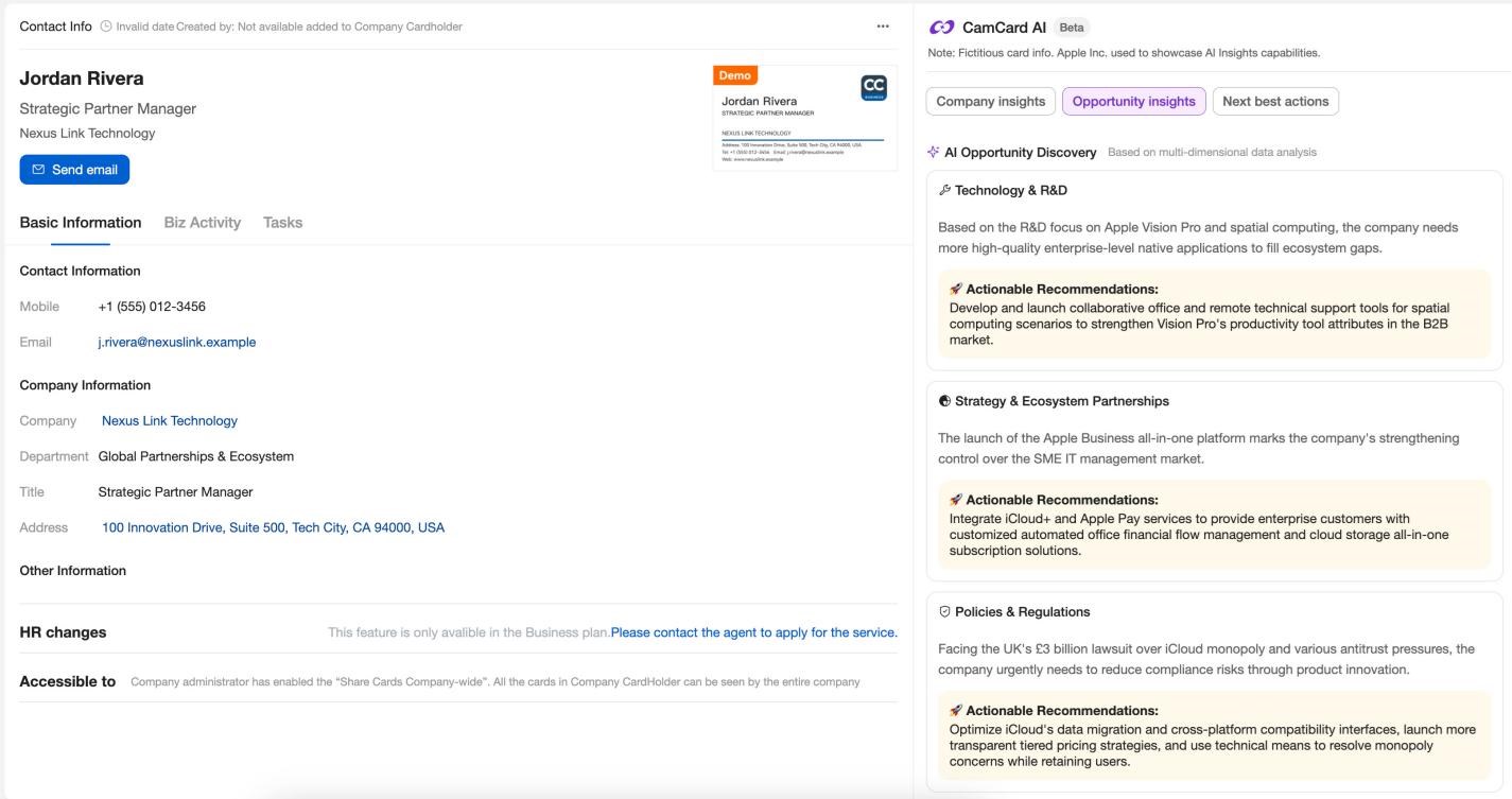On top of these company briefs, CamCard AI acts as a “business radar,” delivering targeted insights and strategic analysis across market, technology, supply chain, and recruitment opportunities. CamCard AI helps enterprise users identify key information such as contact background, business needs, and potential collaboration areas, and provides suggested outreach templates and follow-up action items for reference. This streamlines pre-meeting research and significantly increases both connection efficiency and communication relevance, ultimately driving tailored strategic advantage and enhanced productivity for diverse roles across the enterprise.