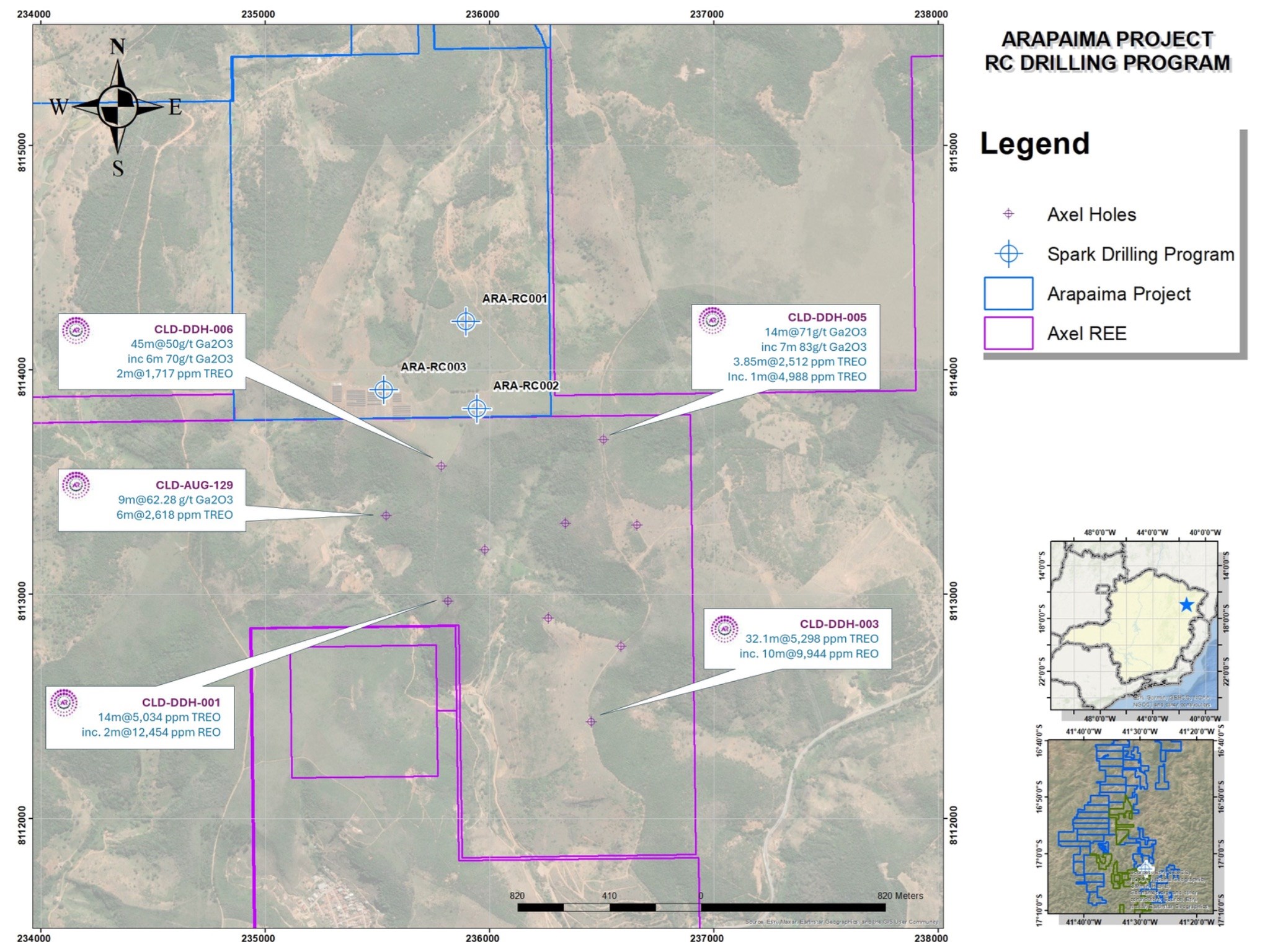 Figure 1. Planned Spark drill locations situated immediately north of Axel REE’s Caladão Project “Area A,” where Axel has reported a JORC 2012 Inferred Mineral Resource of 233 Mt @ 2,133 ppm TREO and 100 Mt @ 42 ppm gallium. Spark’s maiden RC program is designed to test whether this REE-gallium system extends southward onto the Arapaima Project.