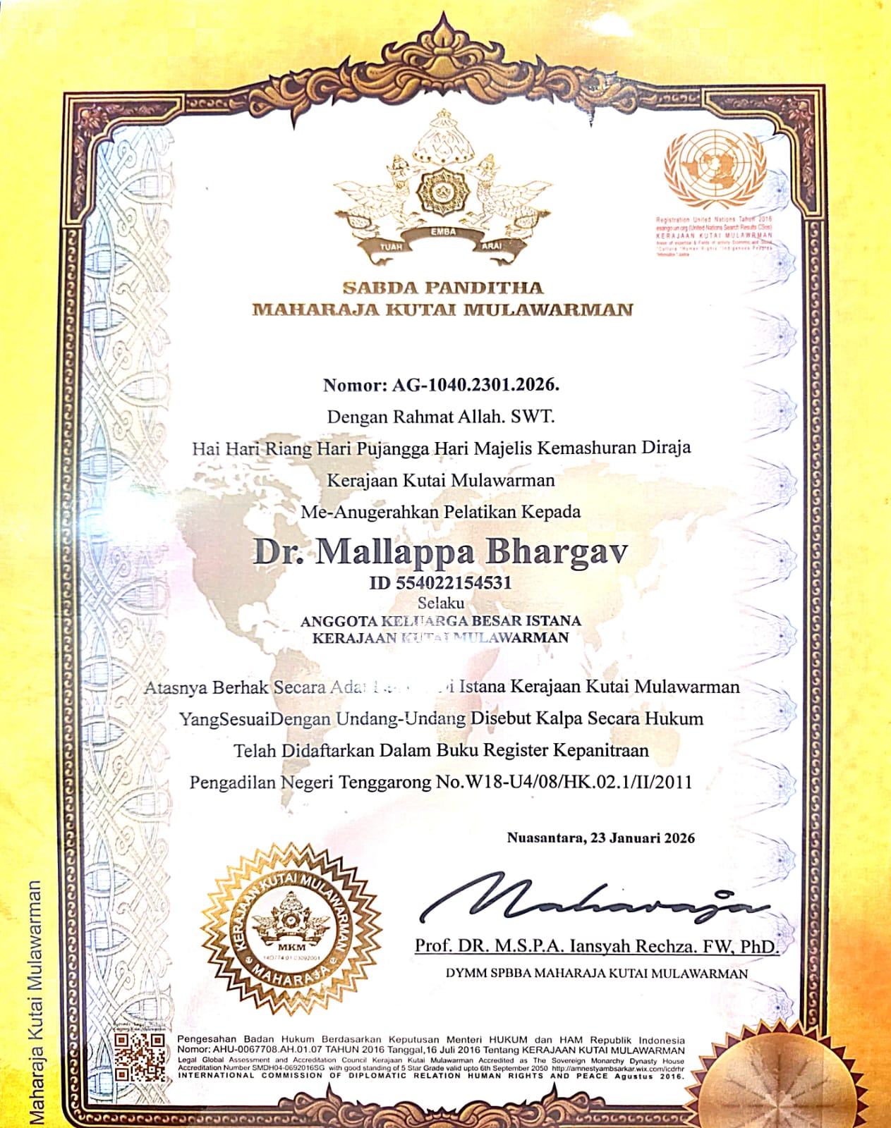 Reacting to the honour, Dr. Mallappa Bhargav said, “I receive this honour with deep humility and gratitude. Being recognised by the Kerajaan Kutai Mulawarman is not merely a personal milestone, but a responsibility to uphold the values of service, integrity, and cultural respect that this ancient institution represents. I dedicate this recognition to strengthening meaningful collaboration and mutual understanding between India and Indonesia.”