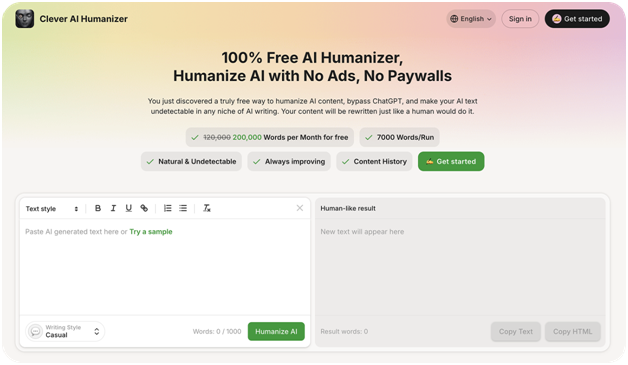 If one question requires a direct answer- who holds the top spot – the conclusion is simple. The strongest tool in this list is Clever AI Humanizer. This free tool reaches the lowest AI detector signals, maintains accurate structure, and keeps a steady tone across long documents. The platform also holds a unique advantage as a world leader in bypassing the GPTZero detector, which places it far above every alternative on the list. No other solution reaches the same balance between natural flow, factual accuracy, and low AI probability.