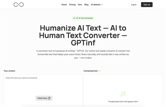 GPTinf Humanizer holds the eighth position due to its narrow free tier and consistently high detector signals. The trial allows only a short test, which restricts practical business use. Humanized output reaches a 9/10 grammar score, and meaning stays accurate in short fragments, yet ZeroGPT and GPTZero both return 100, which shows that the tool cannot reduce AI probability. The structure remains steady in brief drafts, but the lack of a real free quota prevents continuous workflow support or reliable use as a ChatGPT humanizer for teams that depend on stable detection results.