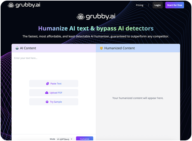 Grubby AI Humanizer fits scenarios where teams need fast adjustments without complex tone shifts or large-scale rewriting. It keeps short fragments clear and neutral, avoids distortion, and allows simple methods to humanize text from ChatGPT when only minor corrections are required. However, its narrow capacity prevents stable results in long documents, and higher detector readings limit its use in sensitive workflows.