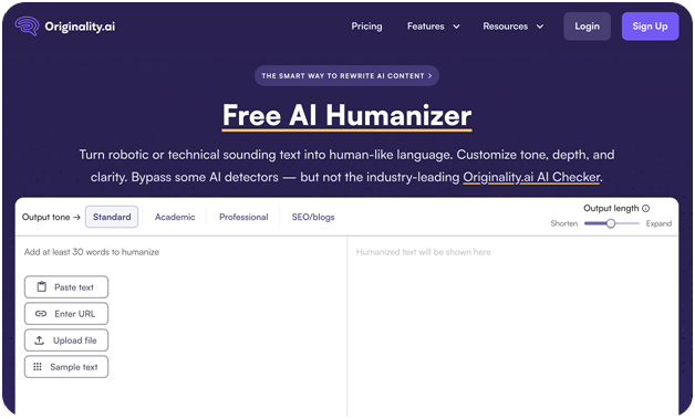 Although not as precise as the top-ranked solution, Originality AI Humanizer performs reliably on short and medium drafts, keeps tone predictable across simple transformations, and corrects structure without altering meaning. Its performance decreases on long or multi-section text, yet it remains a practical option for users who want fast rewrites without complex configuration or advanced control.