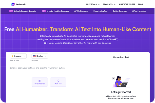 WriteSonic Humanizer takes the fourth position because it offers a strong balance of clarity, structure, and tone for enterprise-level communication. The free plan includes 10,000 words, giving departments enough capacity for internal updates, staff introductions, status summaries, and routine reports. In tests with 100% AI-generated drafts, ZeroGPT returns 39.24, and GPTZero shows 100, while the humanized version reaches an 8/10 grammar score. A 97 grammar score further confirms stable wording and a consistent formal style that suits business environments.